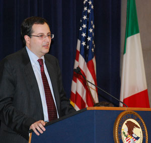 Also speaking at the event were John Di Cicco, the Acting Assistant Attorney General for the Tax Division who gave welcoming remarks, John LaCorte Jr., President of the Italian Historical Society of America, and Cristiano Maggipinto, First Counselor for Social and Consular Affairs at the Embassy of Italy in Washington. Francesco Isgro, of the Department of Justice, was the master of ceremonies, Read the prepared remarks of Thomas Perrelli. |CiaoAmerica.net| |